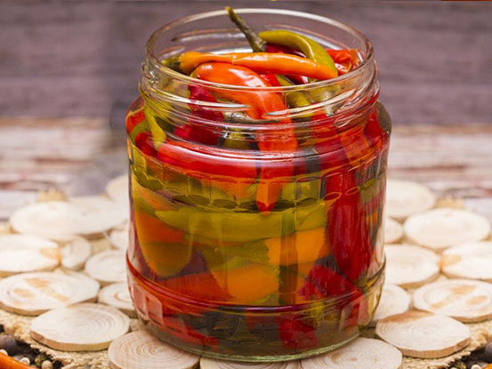 Green or red chillies are packed in a brine solution that preserves their flavor and texture. These chilies can be used directly in cooking or processed into different forms.